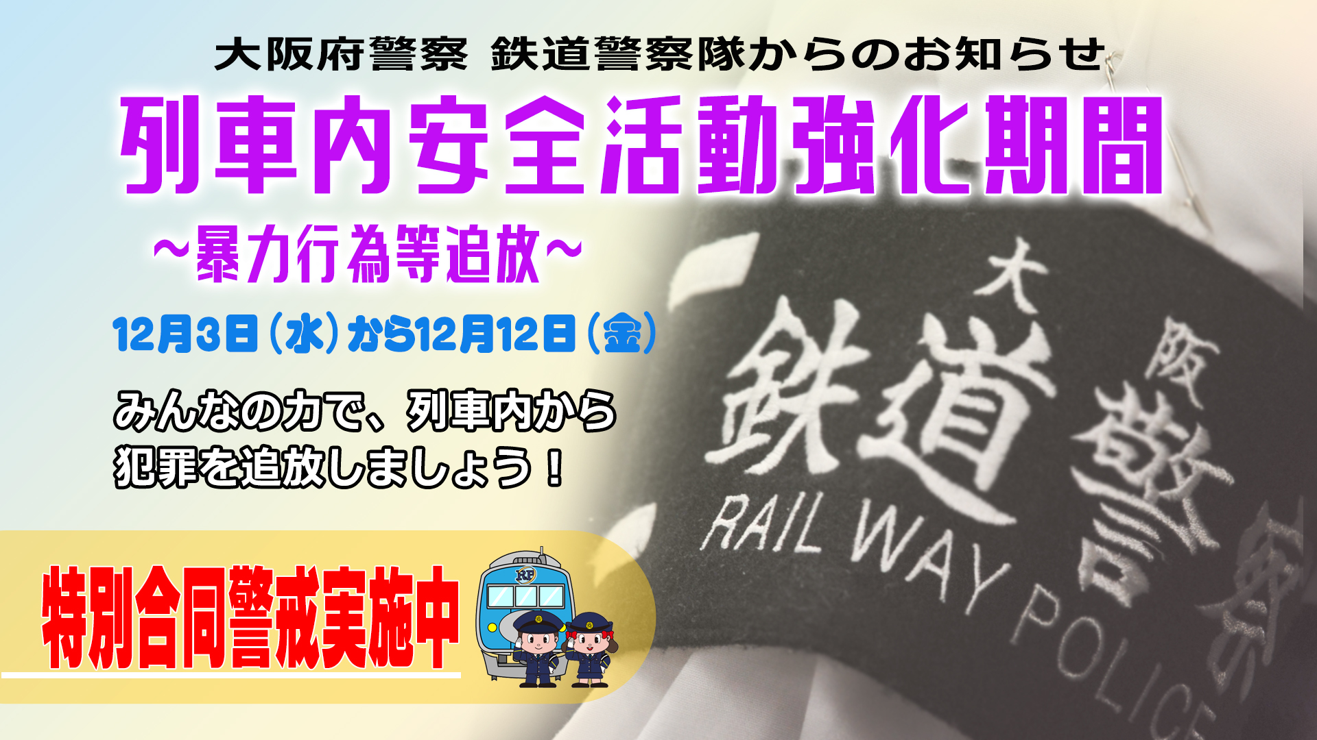 12月3日(水)から12月12日(金)までの10日間、大阪府警察と合同で、列車内の安全活動を強化しています。 暴力行為等の被害に遭われた方、目撃された方は、駅係員又は警察官にお知らせ下さい。 暴力行為は悪質な犯罪です! 力を合わせて、列車内犯罪を追放しましょう!
