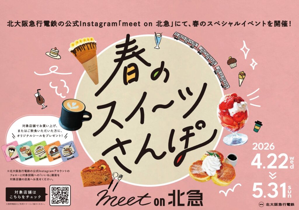 当社Instagramにて、北急沿線の「おいしい」が詰まったスイーツイベントを4月22日(水)からスタートしています✨ 対象店舗でお買い物・ご飲食を楽しみながら、「meet on 北急オリジナルシール」をゲットしませんか?🎁 ✥開催期間:2026年4月22日(水)~2026年5月31日(日) ✥詳しくは当社Instagramをご確認ください。 https://www.instagram.com/kitakyu50/